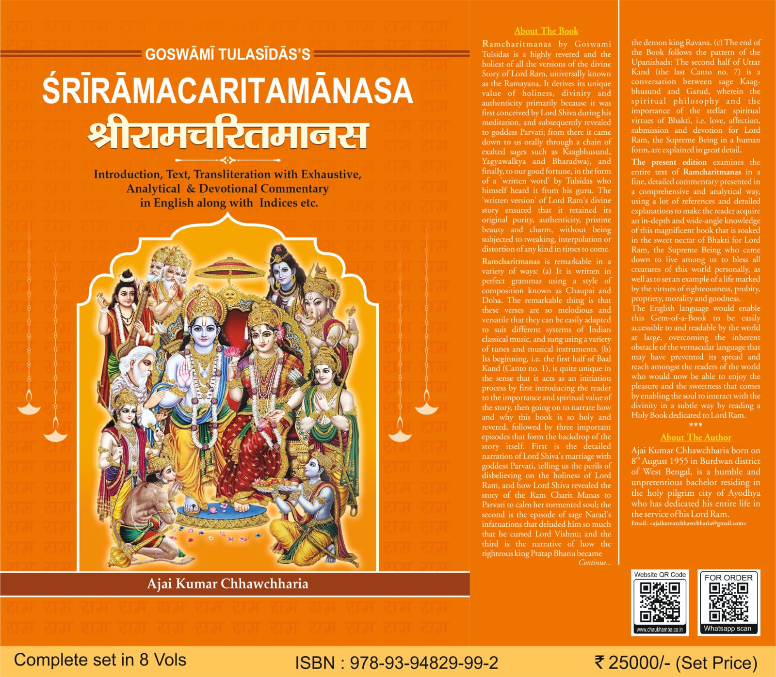 Ramcharitmanas by Goswami Tulsidas is a highly revered and the holiest of all the versions of the divine Story of Lord Ram, universally known as the Ramayana. It derives its unique value of holiness, divinity and authenticity primarily because it was first conceived by Lord Shiva during his meditation, and subsequently revealed to goddess Parvati; from there it came down to us orally through a chain of exalted sages such as Kaagbhusund, Yagyawalkya and Bharadwaj, and finally, to our good fortune, in the form of a 'written word' by Tulsidas who himself heard it from his guru. The 'written version' of Lord Ram's divine story ensured that it retained its original purity, authenticity, pristine beauty and charm, without being subjected to tweaking, interpolation or distortion of any kind in times to come. The present edition examines the entire text of Ramcharitmanas in a fine, detailed commentary presented in a comprehensive and analytical way, using a lot of references and detailed explanations to make the reader acquire an in-depth and wide-angle knowledge of this magnificent book that is soaked in the sweet nectar of Bhakti for Lord Ram, the Supreme Being who came down to live among us to bless all creatures of this world personally, as well as to set an example of a life marked by the virtues of righteousness, probity, propriety, morality and goodness. The English language would enable this Gem-of-a-Book to be easily accessible to and readable by the world at large, overcoming the inherent obstacle of the vernacular language that may have prevented its spread and reach amongst the readers of the world who would now be able to enjoy the pleasure and the sweetness that comes by enabling the soul to interact with the divinity in a subtle way by reading a Holy Book dedicated to Lord Ram. About The Author : Ajai Kumar Chhawchharia born on 8th August 1955 in Burdwan district of West Bengal, is a humble and unpretentious bachelor residing in the holy city of Ayodhya.